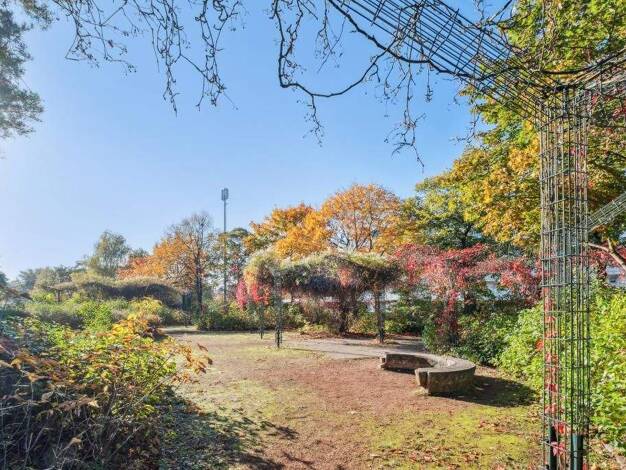 1929 erbaut, grenzt dieses Gebäudeensemble in der Bauweise eines L direkt an eine weitläufige Park- und Sportanlage. Der Effekt - die grundstückseigene Gartenanlage ist durch voluminöse Büsche und Bä...