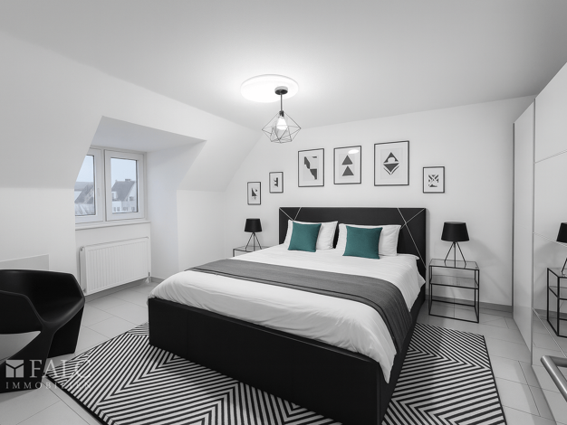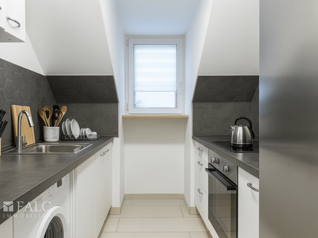 Die Wohnung Nummer 9 befindet sich im Dachgeschoss links und verfügt über eine Wohnfläche von 44 Quadratmetern. Sie besteht aus einem Flur, einem Badezimmer, einem Schlafzimmer, einer Küche und einem...