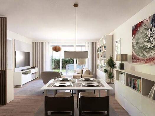 Diese Wohnung schafft eine Atmosphäre, die inspiriert - mit weichen Farben, klaren Linien und Licht, das jede Ecke mit Leben füllt. Die offene Raumgestaltung verbindet Küche, Essen und Wohnen zu eine...