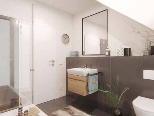 Wohnung Nummer 7 erstreckt sich über das erste und zweite Obergeschoss in Split-Level-Bauweise und hat eine Wohnfläche von 28,68 Quadratmetern. Es besteht aus einem Flur, einem Abstellraum, einem Bad...