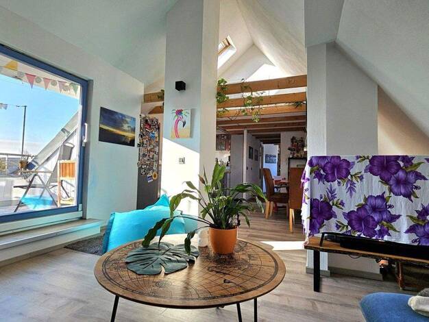 Die lichtdurchflutete und modern geschnittene Dachgeschosswohnung befindet sich in einem gepflegten Mehrfamilienhaus aus dem Jahr 1956 ohne Aufzug. Die Wohnung selbst wurde 1999 ausgebaut. Dabei wurd...