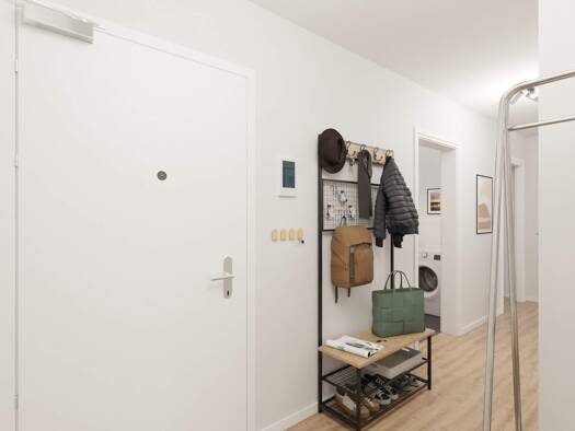 Ein Zuhause mit Komfort: Fußbodenheizung für gemütliche Tage und ein Balkon, der zum Draußen sitzen einlädt. Der Flur öffnet sich zum Herzstück der Wohnung: einem großzügigen Wohnbereich mit offener ...