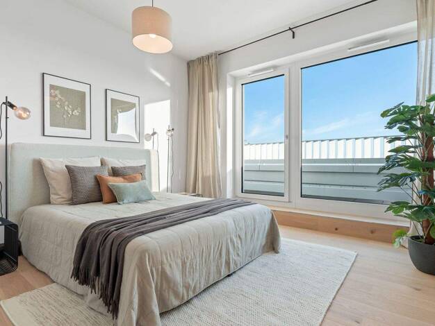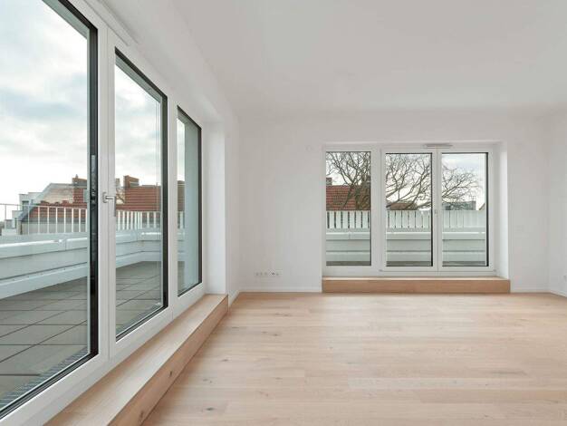 Großzügiges Dachgeschoss in klimafreundlichem Effizienzhaus 40 mit KfW-Förderung. Barrierefreie Penthouse-Wohnung mit großer Dachterrasse mit Weitblick bis zum Amazon-Tower. Hochwertige Ausstattung ...