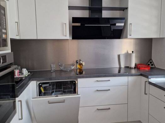 - Wohnraum mit weißem Kork-Boden; - Boden Küche und Bad gefliest, Schlaf-/Kinderzimmer mit Teppichboden; - separates WC; - Einbauküche mit Cerankochfeld, Backofen, Spülmaschine, Kühlschrank, Gefriers...