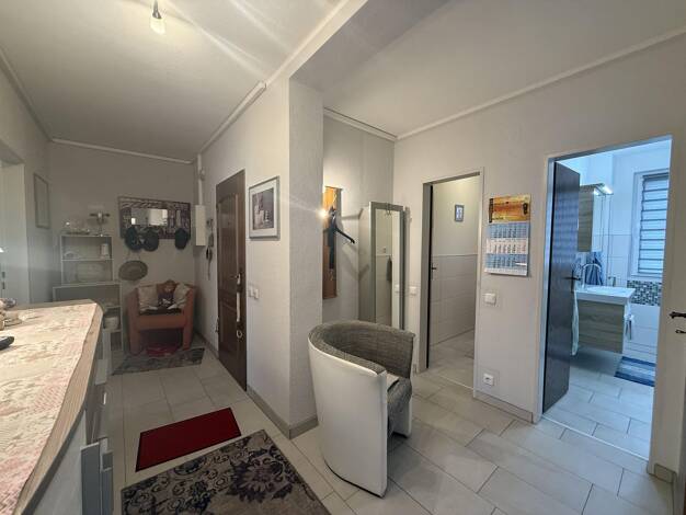 Die zum Verkauf stehende ETW befindet im II. OG/ DG eines Hauses mit weiteren drei Wohnungen und einem Ladenlokal im EG. Über den Seiteneingang gelangt man in das Treppenhaus und weiter zur Hintersei...