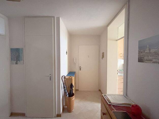 Beim Betreten der Wohnung gelangen Sie in den großen Flurbereich, von dem aus alle Räume der Wohnung zugänglich sind. So die Küche mit kleinem Küchenbalkon, das große Wohn-/Esszimmer mit Zugang zu ei...