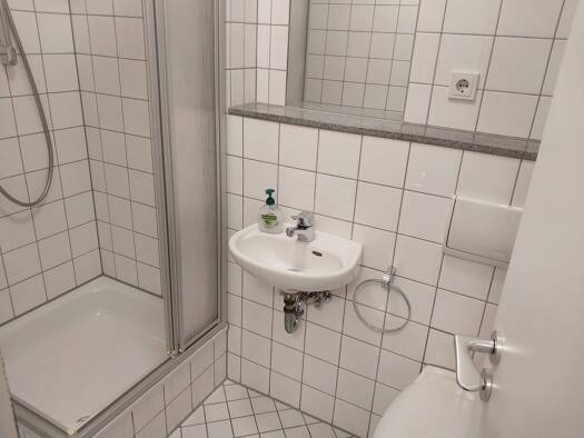 Durch den hohen Drempel von 2 Metern ist die Wohnung gut nutzbar und bietet viel Stellfläche. Sie betreten die Wohnung über einen kleinen Dielenbereich von dem Sie das Duschbad erreichen. Das Wohnzim...