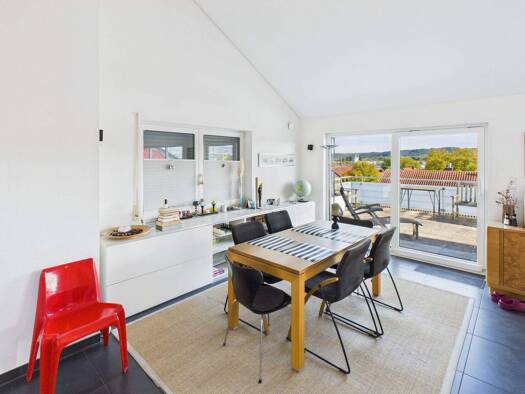 Die Zwei-Zimmer-Wohnung befindet sich im Dachgeschoss eines Mehrfamilienhauses mitten in Rangendingen. Die Wohnung hat ein großes, offenes Wohn- und Esszimmer mit großen Fenstern für sehr viel Tagesl...