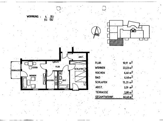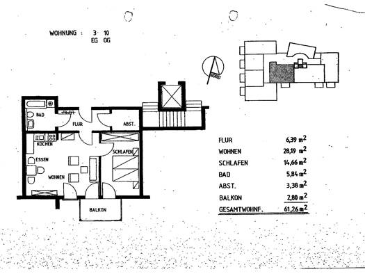 Die Wohnung ist aufgeteilt in Flur mit Zugang zu Küche, WC sowie Wohnzimmer mit Zugang zum Balkon. Vom Wohnzimmer aus gelangt man in einen zweiten Flur. Von da aus sind die übrigen Räume begehbar. Ab...