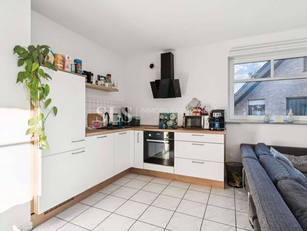 Die Wohnung liegt im ersten Obergeschoss und wirkt bereits beim Betreten angenehm klar. Durch die offene Küche und den hellen Wohnbereich entsteht ein zusammenhängender Raum, der sich leicht möbliere...