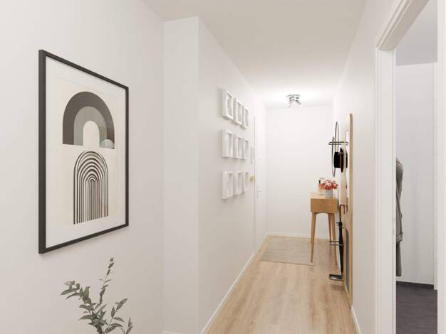 Entdecken Sie diese barrierefreie Wohnung im Erdgeschoss mit einer sonnigen Terrasse. Willkommen in Ihrer neuen Wohnung. Der Eingangsbereich begrüßt Sie mit Platz für Ihre Garderobe und einem Abstell...