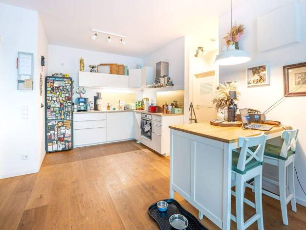 Die stilvolle Wohnung befindet sich im obersten Geschoss eines Mehrfamilienhauses (Baujahr 1984) mit 6 Wohneinheiten. Sie verfügt über 4 Balkone (2 Süd- und 2 Nordbalkone). - Wohn-/Esszimmer mit Kach...