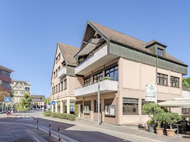 Diese schick modernisierte 3-Zimmer-Wohnung mit Ost-Balkon befindet sich im 1.Obergeschoss (Dachgeschoss mit Flachdach) eines Wohn- und Geschäftshauses direkt im Einkaufszentrum. Im Erdgeschoss des H...