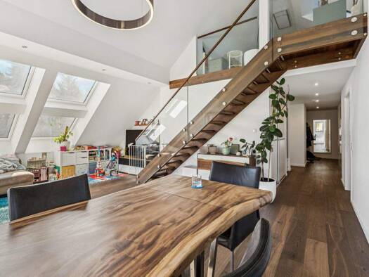 Diese moderne 4,5-Zimmer-Maisonette-Dachgeschosswohnung aus dem Baujahr 2016 vereint stilvolles Wohnen, durchdachte Architektur und urbanen Komfort auf rund 120 m² Wohnfläche. Der Zugang erfolgt bequ...