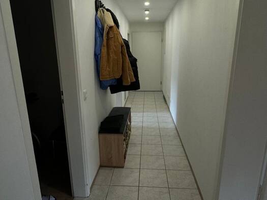 Sie betreten die Wohnung über eine zentral gelegene Diele mit Garderobennische und Zugang zum praktischen Abstellraum. Direkt angrenzend befindet sich das modern ausgestattete Badezimmer mit Waschmas...