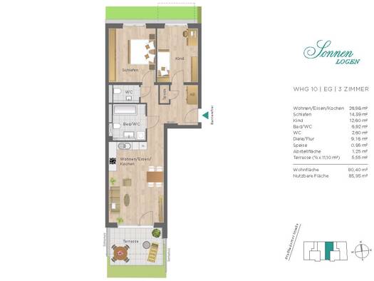 Schöne durchgesteckte 3-Zimmer Wohnung mit einem Wohn-Essbereich und 2 Schlafzimmern. Neben dem Badezimmer verfügt diese Wohnung noch über ein Gäste-WC. Die nach Westen hin ausgerichtete Terrasse ver...