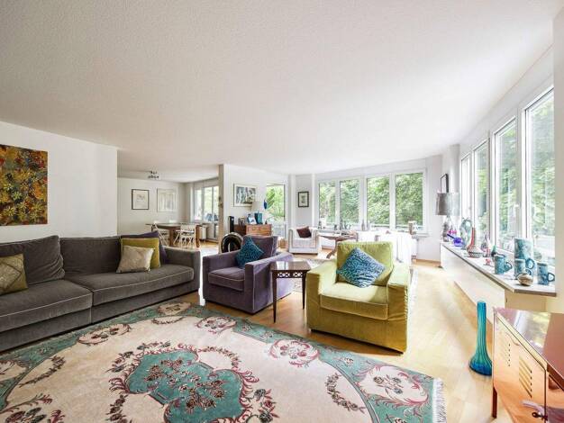 Die Terrassen-Eigentumswohnung bietet durch ihre hochwertigen Ausstattungsmerkmale höchsten Wohnkomfort. Heller lichtdurchfluteter Wohn-Koch/Essbereich mit offenen Kamin, Schiffsbodenparkett aus Eich...