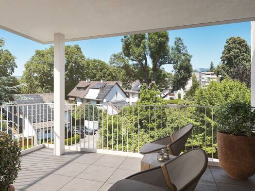 Sonnige Wohnqualität: Die überdachte Terrasse dieser Obergeschosswohnung schafft ein geschütztes Outdoor-Wohnzimmer, das zu jeder Jahreszeit genutzt werden kann. Genießen Sie die Aussicht und das hel...