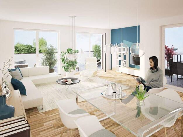 Im Mehrfamilienhaus A6 entsteht diese elegante 4-Zimmer-Penthauswohnung. Die Wohnung ist stufenlos zugänglich (auch über die Tiefgarage), verfügt über eine große Dachterrasse, eine offene Wohnküche (...