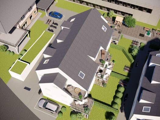 Erstellt werden zwei Baukörper mit jeweils 3 Wohneinheiten, voll unterkellert mit PKW-Außenstellplätzen (je. 7.500 €) und 4 Duplexparker (je. 12.500 €). Die Ausführung erfolgt in ziegelmassiver Bauwe...