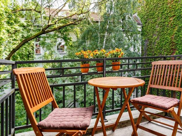 Alle Fenster und die Balkontür dieses charmanten Apartments weisen in den sonnigen Süden, so dass eine intensive Lichtdurchflutung vorliegt. Die Bäume und andere Pflanzen im Gemeinschaftsgarten bilde...