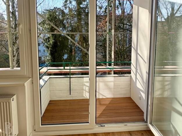 Alle Fenster und die Balkontür dieses charmanten Apartments weisen in den sonnigen Süden, so dass eine intensive Lichtdurchflutung vorliegt. Die Bäume und andere Pflanzen im Gemeinschaftsgarten bilde...