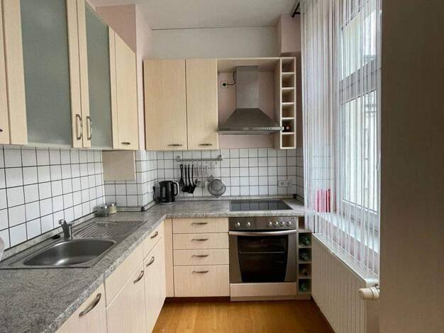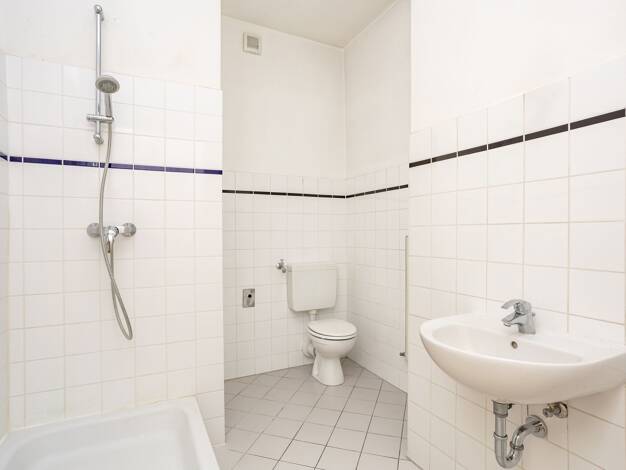 Diese attraktive Wohnung ist durch ein stilvolles Entree und Treppenhaus zugänglich. Die gleich nach der Wohnungstür abzweigende Einbauküche ist älteren Datums, aber funktional. Das angrenzende Dusch...