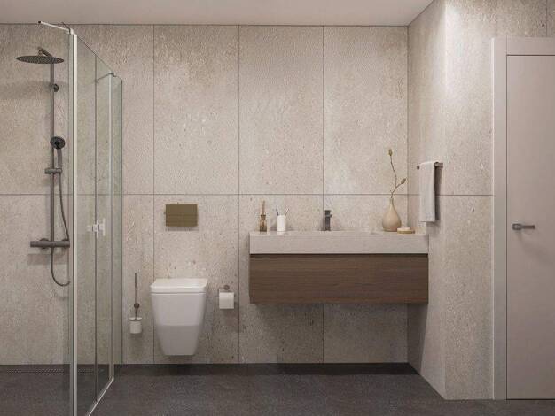 Diese attraktive Wohnung öffnet sich mit einer Diele, in der eine Garderobe Platz findet. Zur anderen Seite geht das klassisch weiß geflieste Badezimmer – u.a. mit Wanne – ab. Durch eine Glastür ist ...