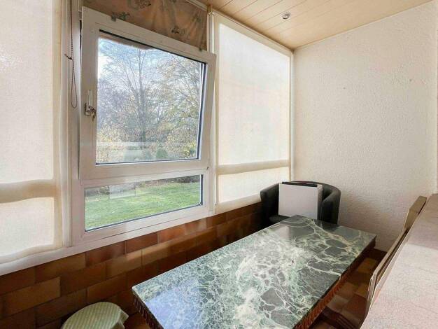 Über einen freundlichen Laubengang erreicht man diese gepflegte Einzimmerwohnung in einem Mehrfamilienhaus aus dem Jahr 1976. Der kleine Vorbereich mit Tisch und Stühlen verleiht dem Zugang eine ange...