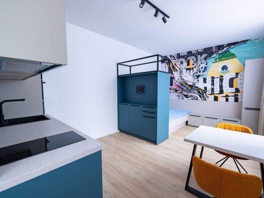 Die top moderne voll möblierte 1 Zimmer-Wohnung befindet sich im 1. Obergeschoß eines Mehrfamilienhauses, das sich auf 9 Etagen verteilt. Der Wohn-, Ess- und Kochbereich ist attraktiv unterteilt. Die...