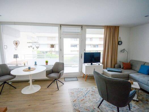 Dieses Appartement ist ideal für alle Liebhaber der niedrigeren Wohnlagen, denn es befindet sich auf der 1. Etage der Residenz und bietet einen Ausblick auf den Strand zum Greifen nah. Ab morgens kön...