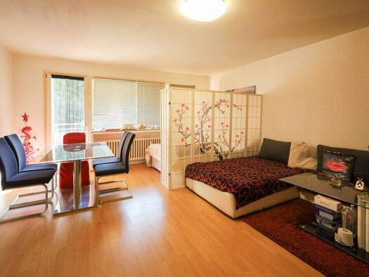 Über einen freundlichen Laubengang erreicht man diese gepflegte Einzimmerwohnung in einem Mehrfamilienhaus aus dem Jahr 1976. Der kleine Vorbereich mit Tisch und Stühlen verleiht dem Zugang eine ange...