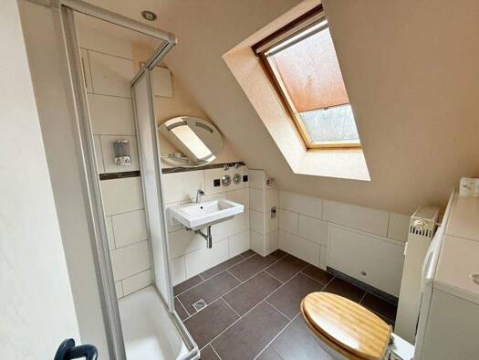 Über 4 Stufen erreichen Sie den Flur der Wohnung. Das WC ist separat, das Schlafzimmer hat Platz für ein Doppelbett und einen Schrank. Das helle Bad hat ein Waschbecken und eine bodentiefe Dusche, hi...