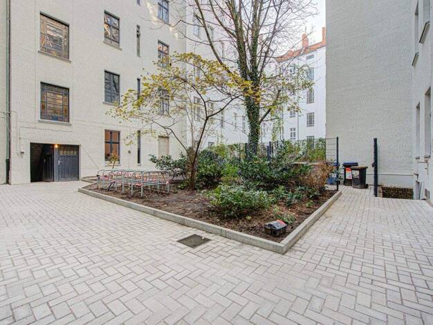 Die Wohnung Nr. 6 im ersten Stock, rechts in der Mitte (im Gartenhaus gelegen), umfasst 44,30 Quadratmeter Wohnfläche und besteht aus einem Flur, einem Gäste-WC, einem Schlafzimmer, einem Badezimmer ...