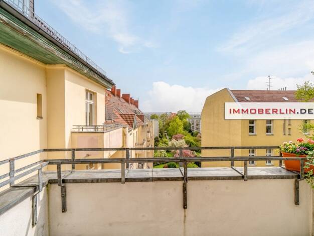 Etage: 4.OG Deckenhöhen: ca. 2,74-3,2 m Fenster: Doppelverglaste moderne Iso-Holz- und Kunststofffenster Boden: Laminat auf wahrscheinlich alten Dielen Stuck: ja, im Schlafzimmer Balkon: ja Wände: Ra...