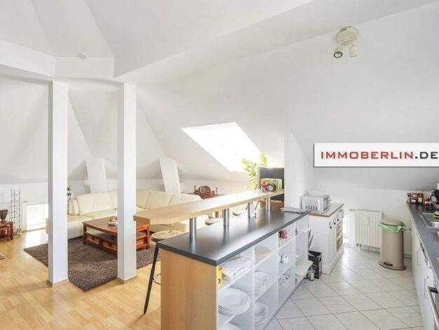 Diese Dachgeschosswohnung ist exzellent für maximal zwei Personen raumstrukturiert. Großzügig wirken die Räumlichkeiten aufgrund ihrer hohen Decken bis in den Dachfirst. Über eine Wohndiele ist der g...