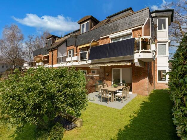 Unser elegantes Ensemble umschließt einen mit Bäumen bepflanzten Innenhof mit Kinderspielfläche, der nach Süden hin mit einer Hecke und weiteren Bäumen abschließt. Ungewöhnlich große Gartenanteile, B...