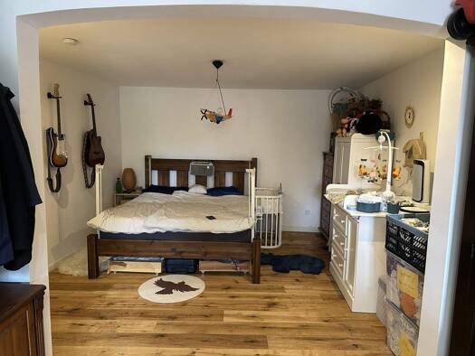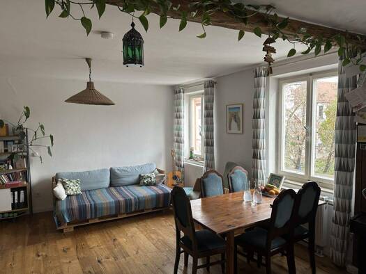 Denkmalgeschützte Altbauwohnung mit einem großen Wohnzimmer sowie einer einzigartigen Wohnküche aus Holz (inkl. Elektrogeräte), die im Preis inbegriffen ist (PROVISIONSFREI). Das lichtdurchflutete Ba...