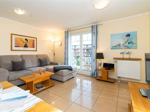 Diese geschmackvoll eingerichtete 2-Zimmer-Wohnung befindet sich im 5. Obergeschoss eines gepflegten Mehrfamilienhauses, nur wenige Schritte vom wunderschönen Weststrand und der lebendigen Strandprom...