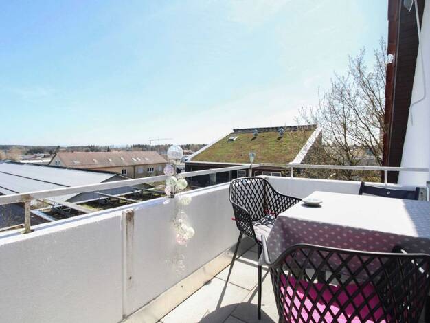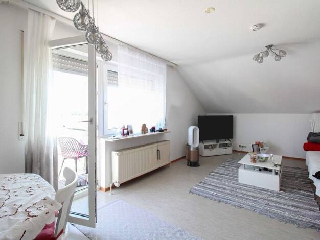 * OBJEKT Starterwohnung - Helle, gemütliche 3-Zimmer-Eigentumswohnung im Dachgeschoss mit Balkon, Einbauküche & TG-Stellplatz Wohn-Essbereich, weiteres Zimmer – jeweils mit Balkonzugang, Küche, S...