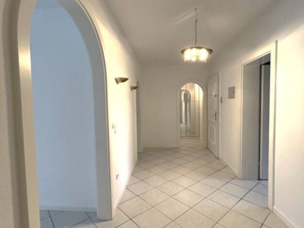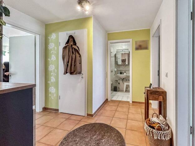 Beim Betreten der Wohnung befindet man sich zunächst im zentralen Flur, der einen Überblick über die gesamte Raumaufteilung bietet. Von hier aus gelangt man direkt in den großzügigen Wohn- und Essber...