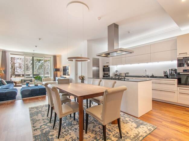Ein Steinwurf von der Alster entfernt: In moderner Architektur präsentiert sich die großzügige Wohnung hell und stilvoll.