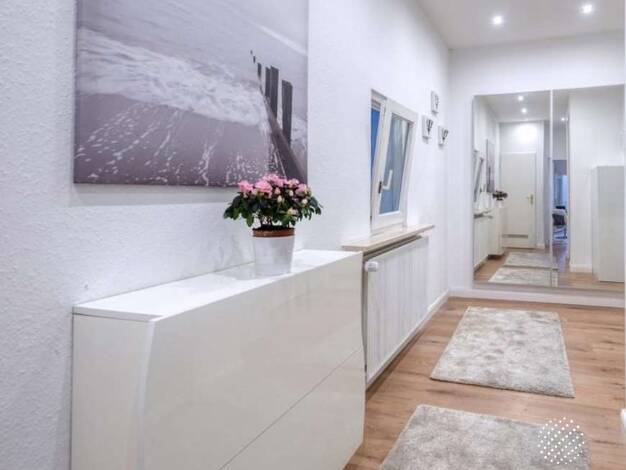 Beim Betreten der Wohnung gelangt man in einen weitläufigen Flur, der zentral zu allen Räumen führt. Hier gibt es ausreichend Platz für eine stilvolle Garderobe und zusätzliche Stauraummöglichkeiten ...