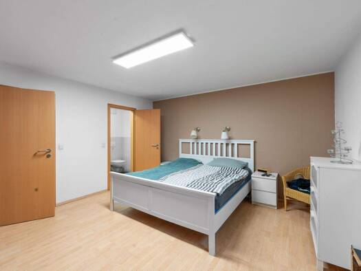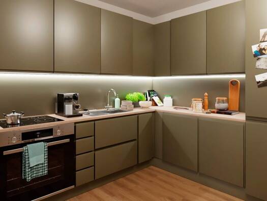 Beim Betreten der Wohnung befindet sich auf der linken Seite das Gäste-WC. Rechts liegt die offene, modern gestaltete Küche, die zum gemütlichen Verweilen einlädt. Weiter geradeaus gelangt man in das...