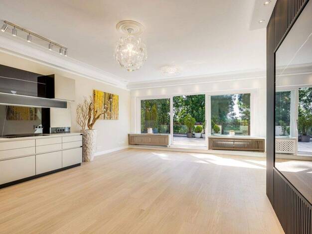 Die beeindruckende Gartenwohnung erstreckt sich mit einer Wohnfläche von ca. 185 qm über 4 großzügige Zimmer und einen direkt verbundenen Souterrainbereich, welcher in der gleichen hochwertigen Ausst...