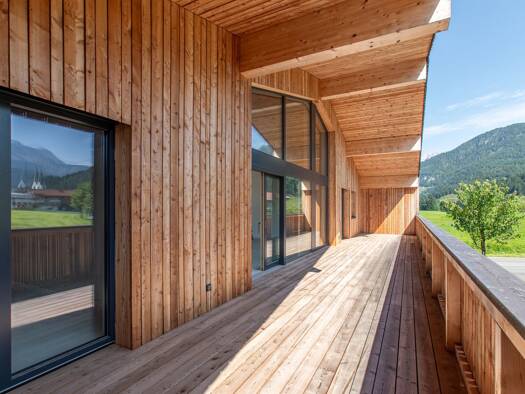 _Alpenländisch typischer Baukörper mit edlen Lerchenholzelementen _Hochwertiges ökologisches energieeffizientes Gebäude nach den KfW55-Standard _Kellerabteile für jede Wohnung und Gemeinschafts-Fahrr...