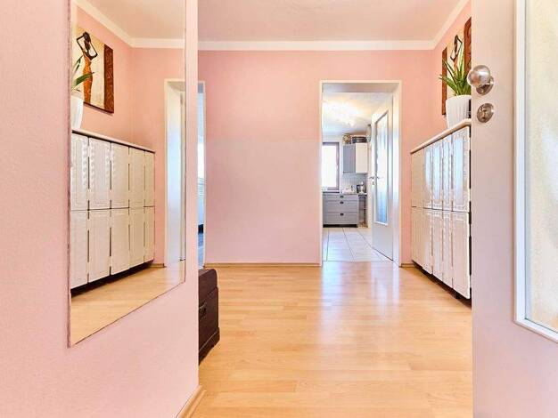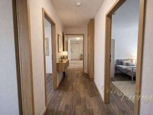 Die Wohnung wird über den Haupteingang betreten und eröffnet sich mit einem außergewöhnlich langen, zentralen Flur, der sich durch die gesamte Wohneinheit erstreckt und als verbindendes Element zwisc...