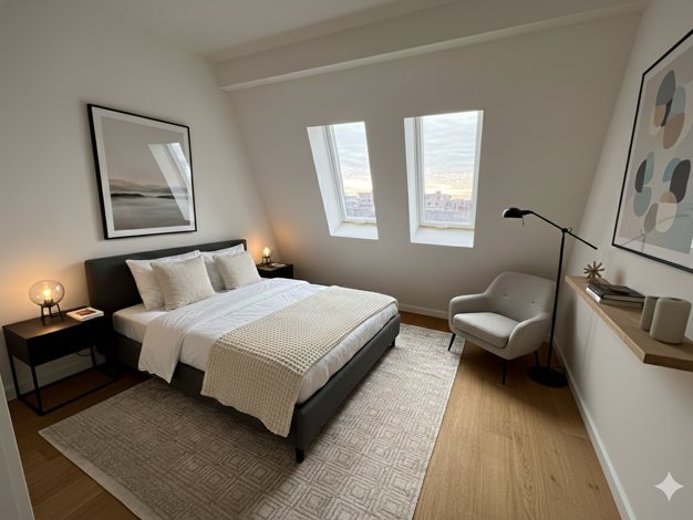 Dieses Penthouse fasziniert mit sensationellen Architekturdimensionen über zwei Etagen. Die vielen bodentiefen Fenster bzw. französischen Balkons, Velux-Dachflächenfenster mit Regensensor und andere ...