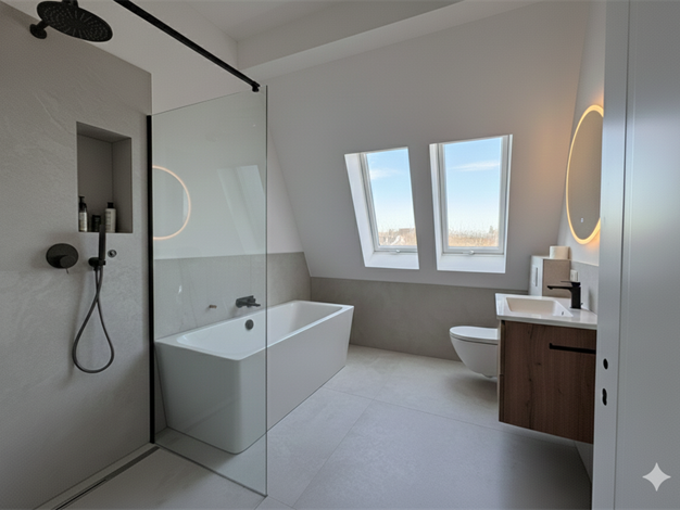 Großzügiges Dachgeschoss mit hohen Decken, großer Sonnen-Terrasse und Weitblick über die Stadt in klimafreundlichem Effizienzhaus 40 mit KfW-Förderung. Mit zwei Bädern plus Hauswirtschaftsraum, hoch...