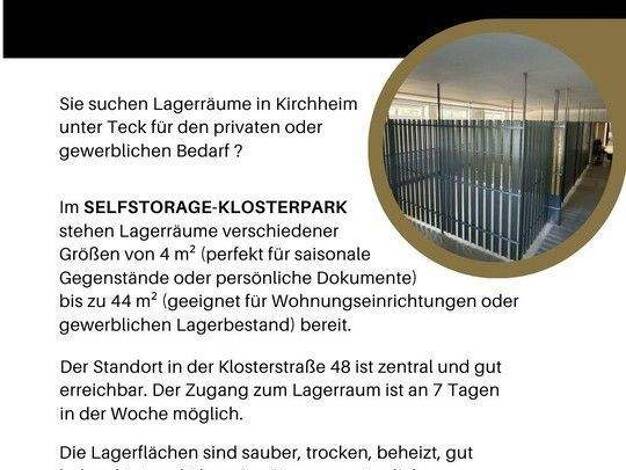 Sie suchen Lagerräume in Kirchheim unter Teck für den privaten oder gewerblichen Bedarf? Im selfstorage-klosterpark stehen Lagerräume verschiedener Größen von 4 m² (perfekt für saisonale Gegenstände ...